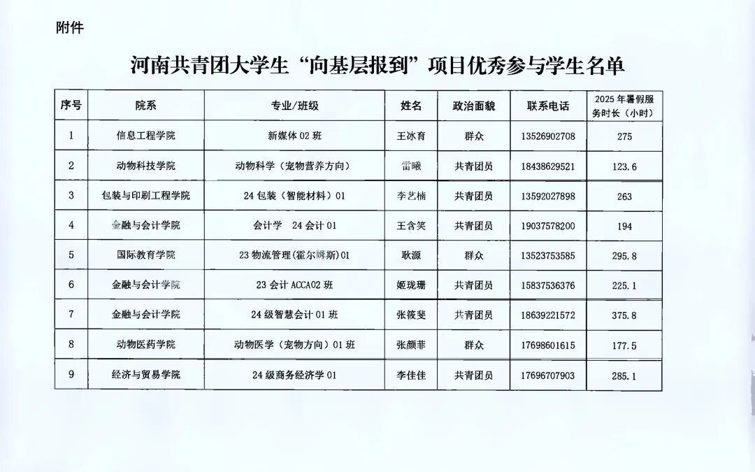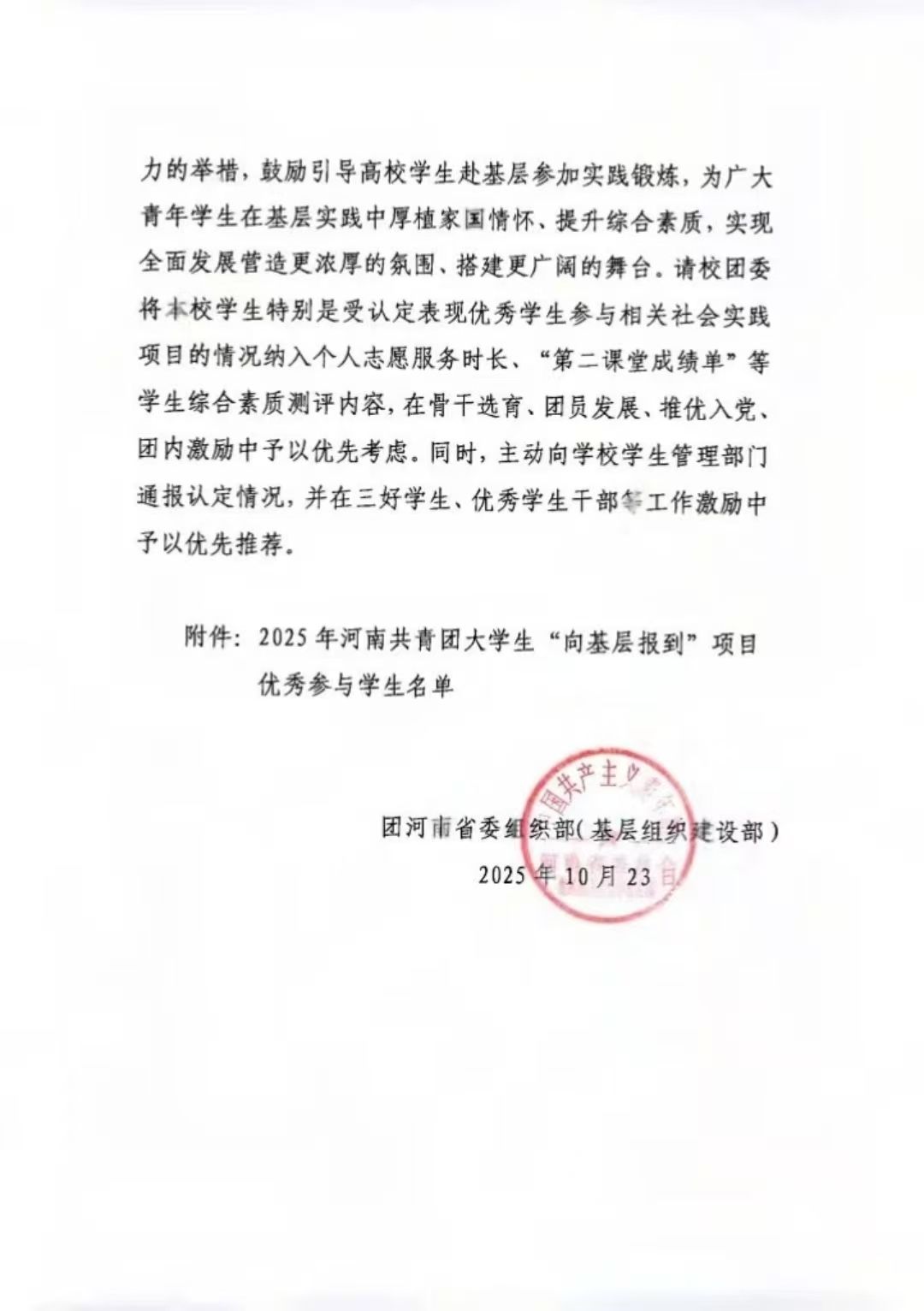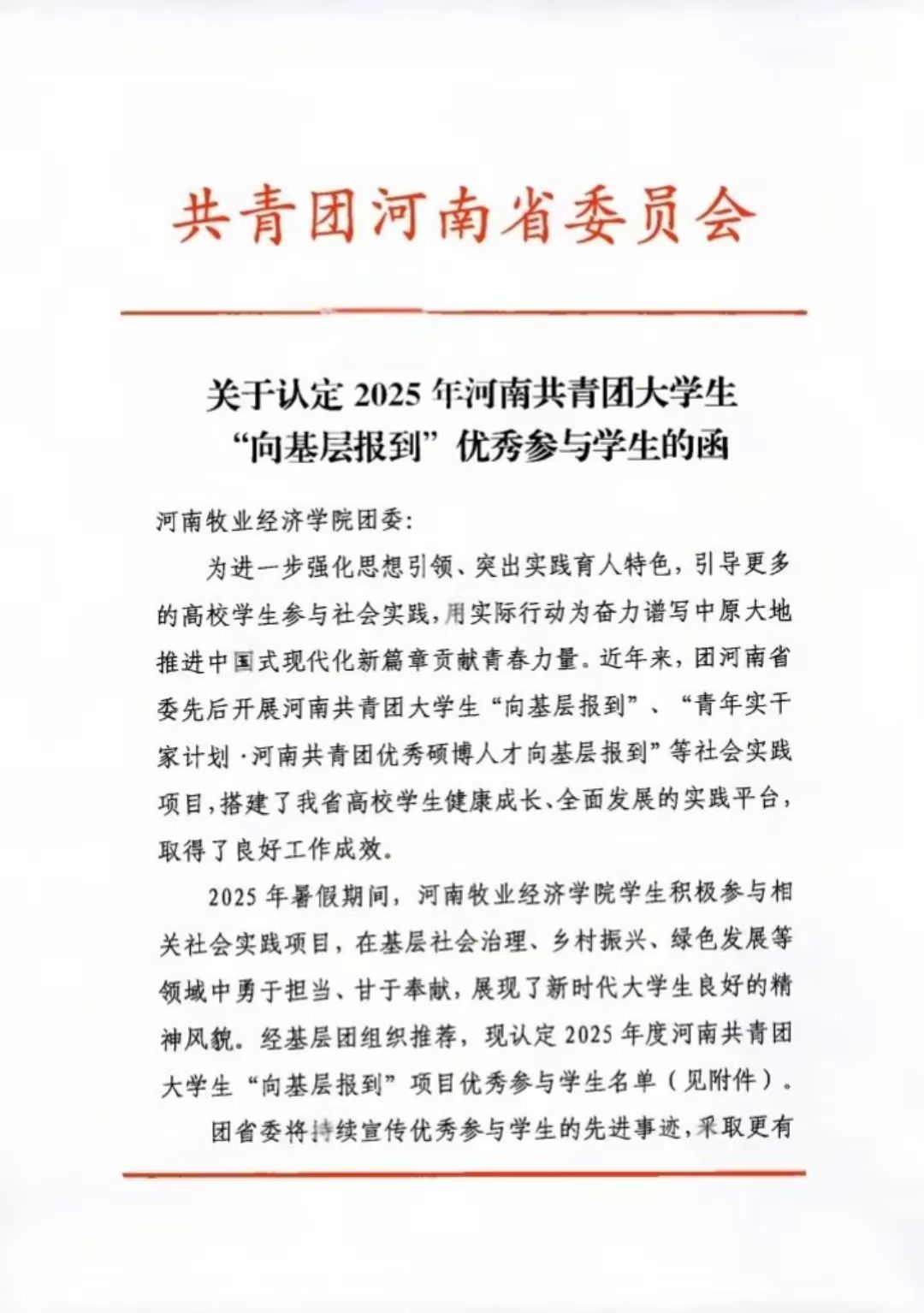 近日,共青团河南省委公布2025年“向基层报到”项目优秀参与学生名单,我校学子凭借在基层服务中的亮眼实绩、务实作风与扎实成效,成功获评“优秀参与学生”荣誉称号。