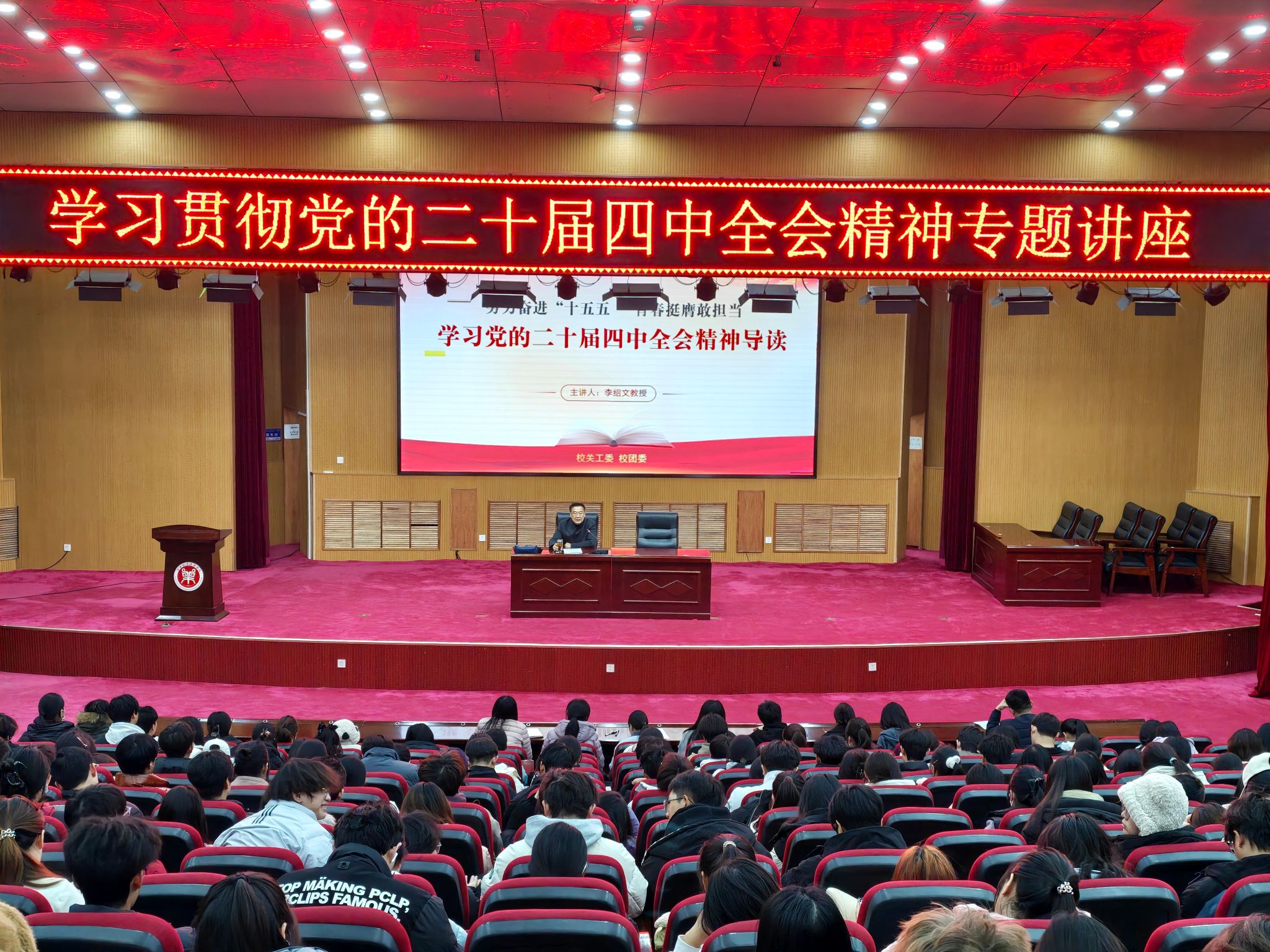 为深入学习宣传贯彻党的二十届四中全会精神,校团委联合校关工委于12月4日下午在英才校区大礼堂举办“学习贯彻党的二十届四中全会精神专题讲座”,本次讲座邀请校关工委常务副主任李绍文为我校师生授课。校团委老师、校级“青马工程”学员及学生骨干600余人参加了本次讲座,校团委书记王森主持。